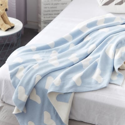 Double Sided Cotton Knitted Blanket - Bed Throw - Light Blue Hearts